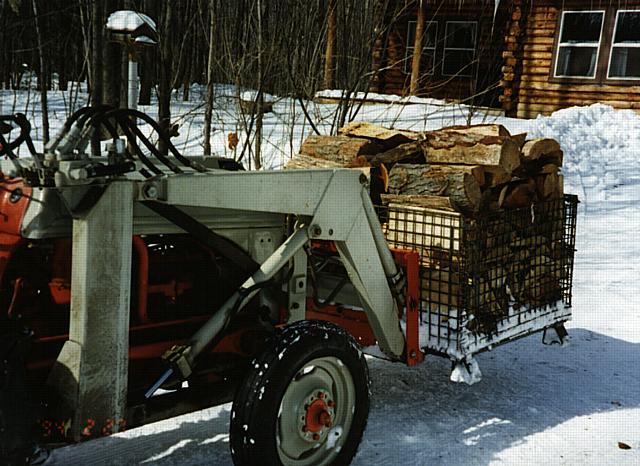 The loader does double duty with a lift frame and forks to move firewood from the wood shed to the house. The lift frame works on the loader and the 3 point hitch with special reversible pins. Another design of my Father's. |