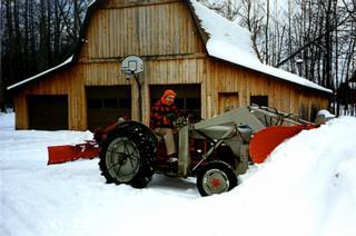 Plowing snow with my loader mounted V-Blade. The loader and V-Blade were designed and built by my Father in 1981. It has held up to some very hard use and abuse over the years, with only a couple of welds cracking and a few coats of paint. The loader mounting makes it easy to push back banks and take the top layer off of deep or heavy snow. The V-Blade approach works very well in crusty or wet snow since the tractor doesn't get pushed sideways. |